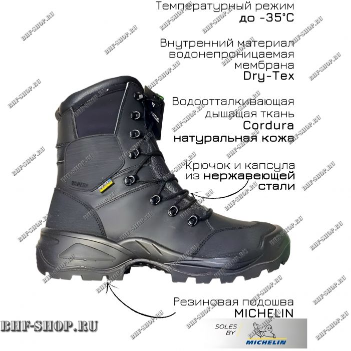 Ботинки изготовлены с использованием литьевого метода подошвы Michelin из полиуретана двойной плотности с особенным рисунком, что обеспечивает отличное сцепление с поверхностью и устойчивость при ходьбе. Шнурки из полиэстера с крючками и капсулами из нержавеющей стали позволяют быстро и надёжно зашнуровать ботинки, обеспечивая плотную фиксацию стопы.