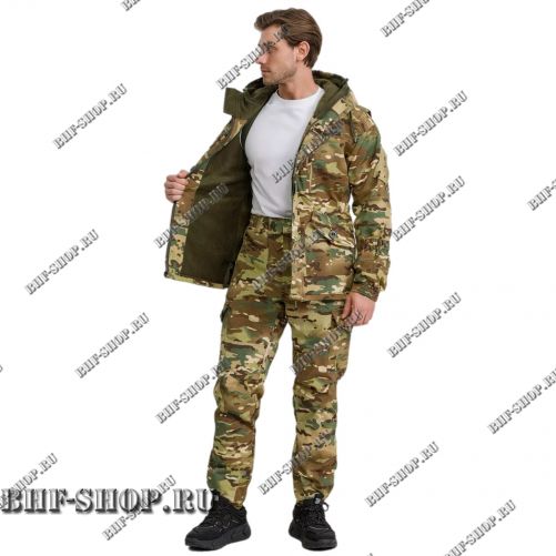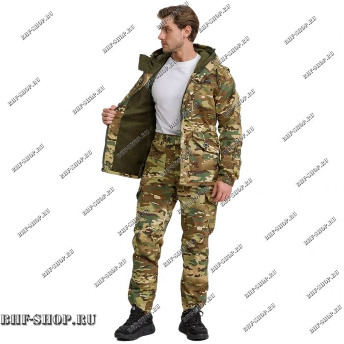 Основой костюма служит прочная ткань рип-стоп — материал, известный своей устойчивостью к износу и разрывам. Благодаря специальному переплетению нитей, ткань выдерживает серьезные нагрузки, что делает костюм идеальным для активного использования в полевых условиях, на охоте, рыбалке или в походах. Вставки из рип-стопа в цвет костюма усиливают наиболее уязвимые зоны и гармонично дополняют внешний вид.