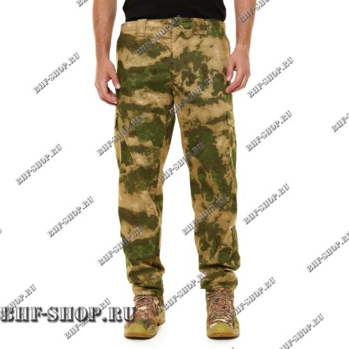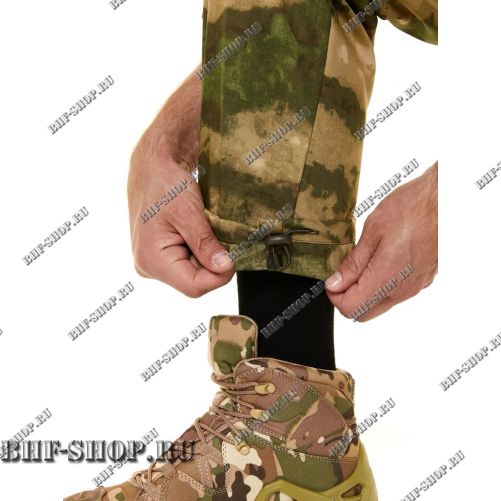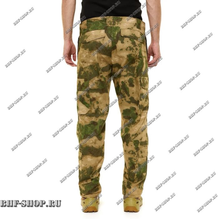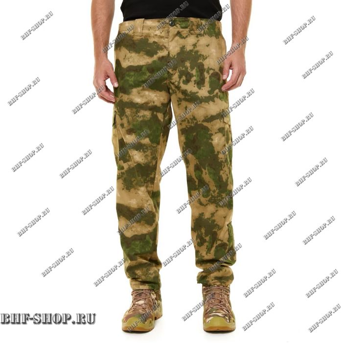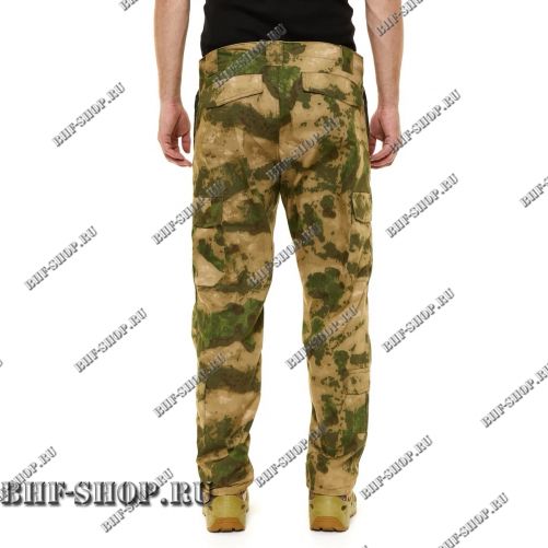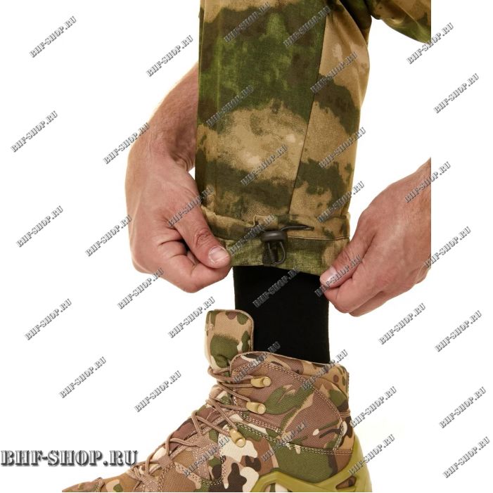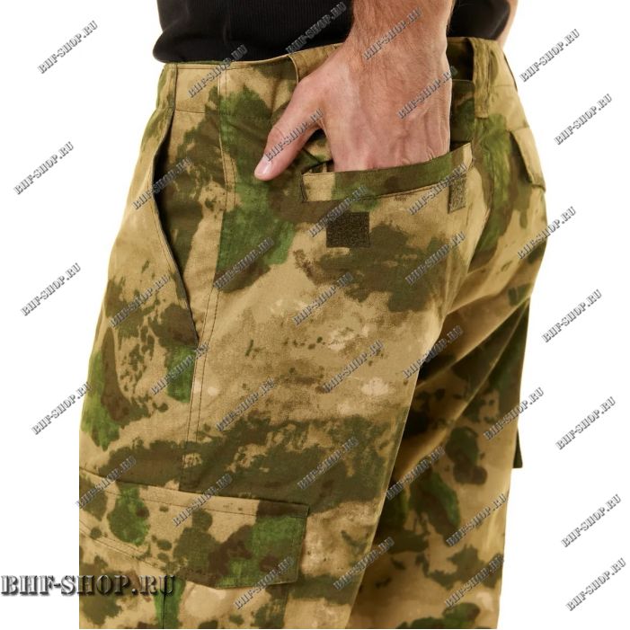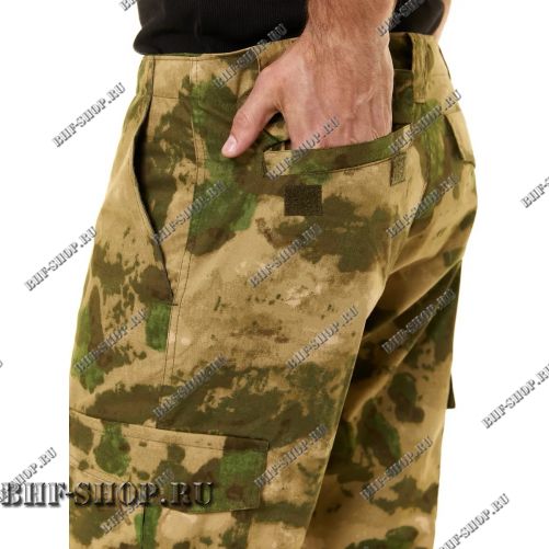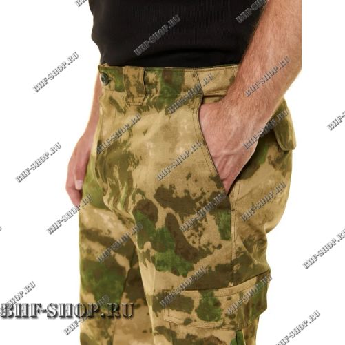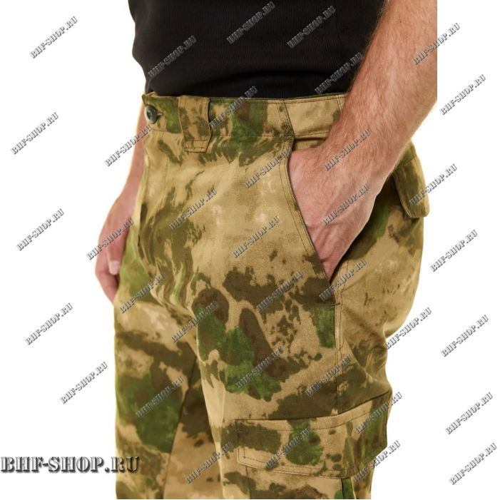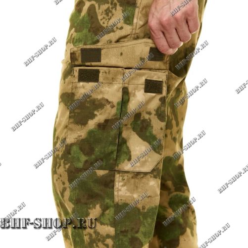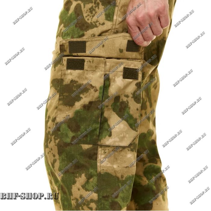 Брюки выполнены с учетом активного использования: прочный пояс на пуговице, пять шлевок под ремень, удобные прорезные и накладные карманы, включая дополнительные в нижней части. Задние карманы с липучками обеспечивают безопасность содержимого, а утяжка по низу штанин позволяет адаптировать посадку под любую обувь.
