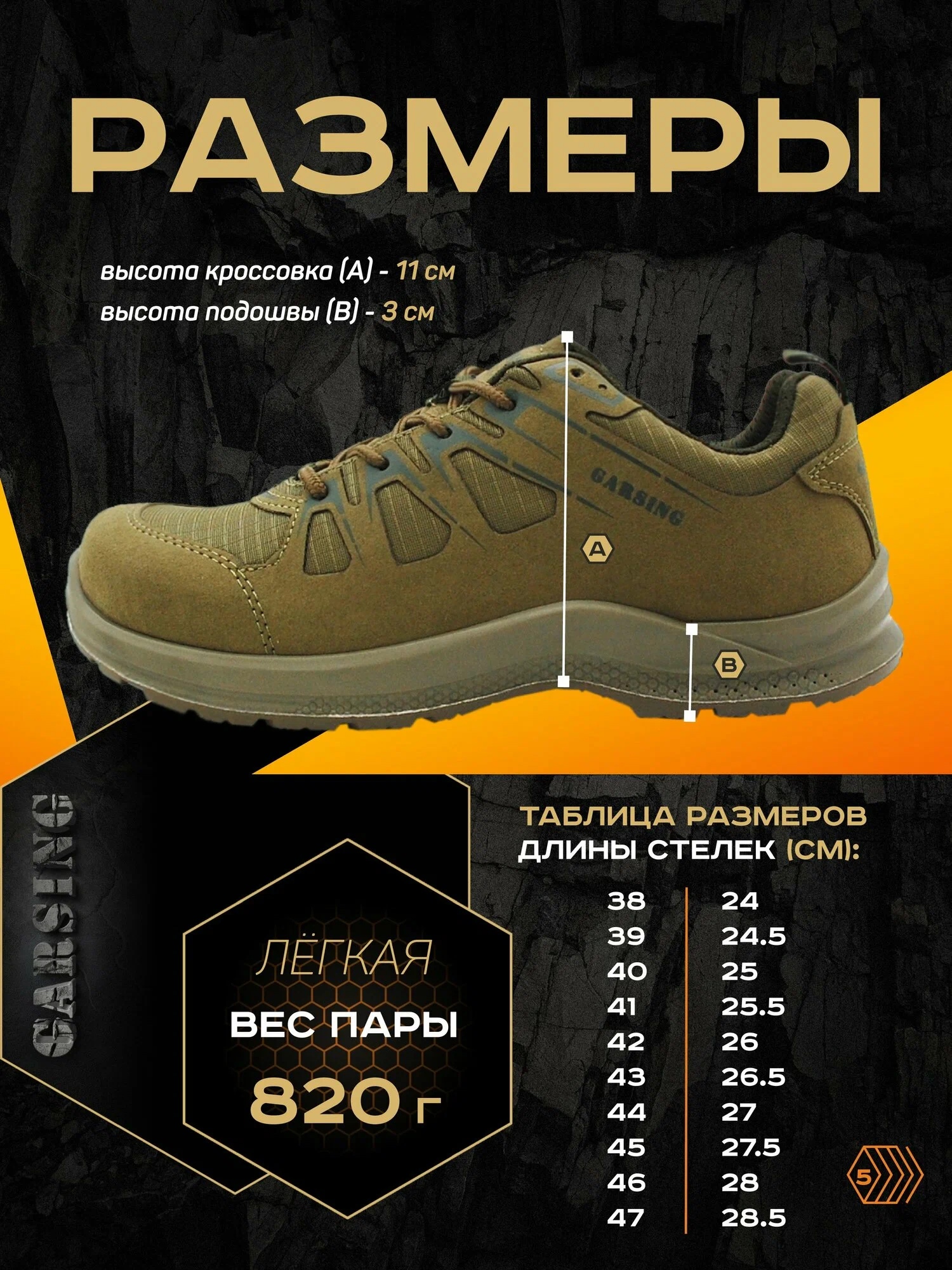 Garsing 189 Олива — это выбор тех, кто ценит практичность, комфорт и уверенность в любой ситуации. Универсальный размерный ряд с 38 по 47 позволяет подобрать идеальную посадку, а продуманная конструкция делает эти кроссовки надежным спутником на каждый день.